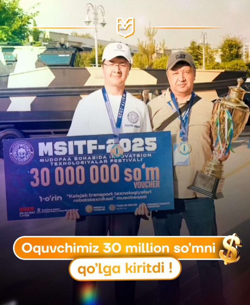 Our student Samandar Khudanov took 1st place in the category “Future Transport Technologies” at MSITF-2025 — the Innovation Technologies Festival, earning a 30 million UZS cash prize!